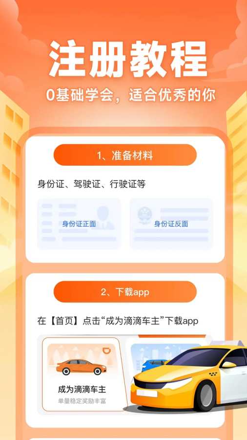 整合市面上主流的快车平台,详细的注册步骤,帮助司机快速完成注册,大大节省注册时间与精力,快速开启接单之旅。