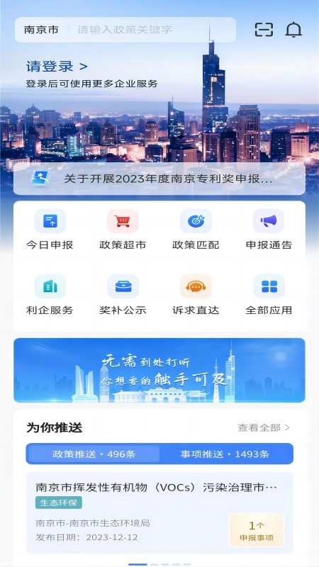 “宁企通”惠企综合服务平台聚焦企业反映的惠企政策“找不到、看不懂、申报难”,以及利企服务散而乱的问题,坚持需求导向、问题导向,推动全市惠企政策精准直达企业。平台定位为全市惠企服务“总入口”,也是财政奖补政策兑现“总平台”。平台集“惠企政策、便企办事、利企服务、政企互动”四大功能于一体,实现南京市惠企政策一站汇聚,奖补事项一网申报,政策匹配一键推送,政企互动一线直达。平台已累计汇集国家、省、市惠企政策事项数千余条,注册企业数达100万。平台先后被国家、省、市相关部门评为经典示范案例向全国推广。