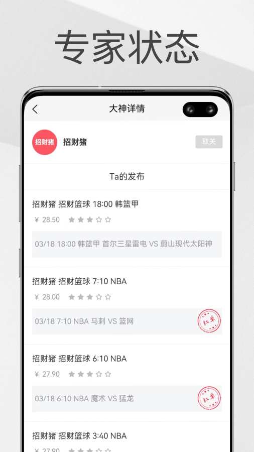 关注自己喜欢的专家,可及时获取专家更新的预测和分析信息,让你提前参考比赛结果。