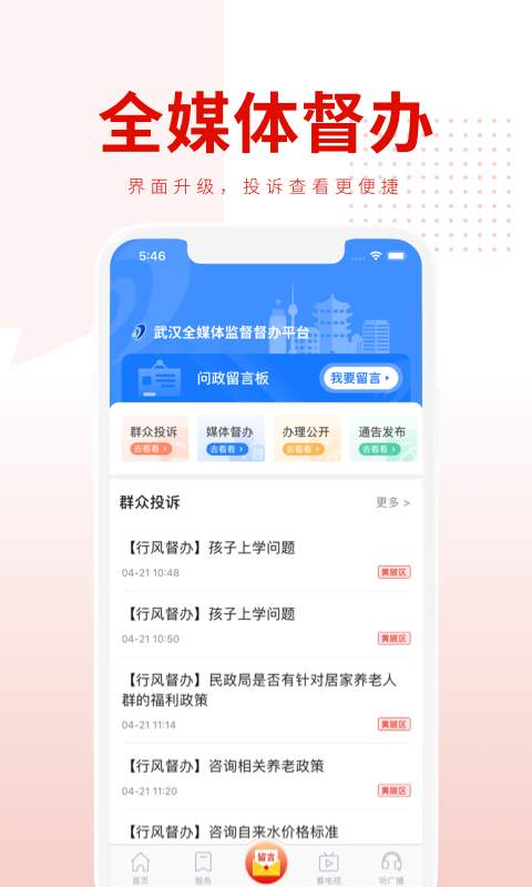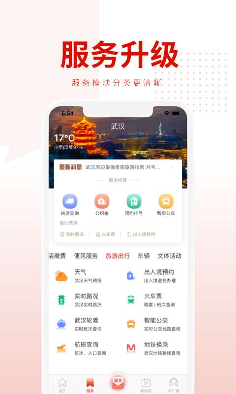 掌上武汉,版面样式实现全面颠覆,UI设计与用户体验完美融合,界面元素更加多样,轻松实现图文、视频的混排,新 闻、分享、直播、点播页面,更加符合用户视觉,带来全新的操作体验。 APP功能板块增至21个,个性化定制。掌上武汉新增网上交管、城区、教育、亲子、美食、办事指南等多 个民生实用板块,用户通过掌上武汉即可实现网上缴纳违章、问政职能部门、在线教育、参与亲子活动、查看拨打热线等 多种功能,用户可根据自身需求选择功能模块进行个性化定制服务