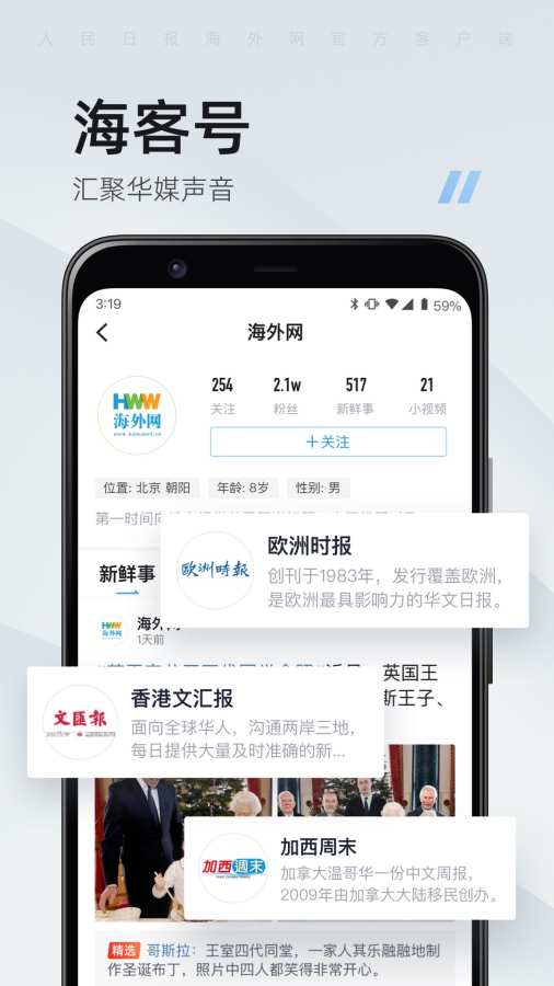 海客是人民日报海外版着力打造的综合类新闻客户端。居家看海客,掌握世界的每一秒钟。出行看海客,海外社交生活一站搞定。