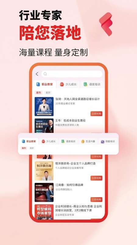 同时,从强大的流量入口形成品牌入口,获课逐渐吸引全中国的名师和优秀的知识内容创作者加入平台,秉承“精品策略”共同专研打磨,搭建完善优质的口碑课程体系,涵盖企业管理、资本模式、股权激励、营销创新、消费增长、财税筹划、人文素养等多个模块!通过线上或线下讲授,目前已经为遍布国内外的20多万学员提供了精细的学习服务,成为城市的认知高地。