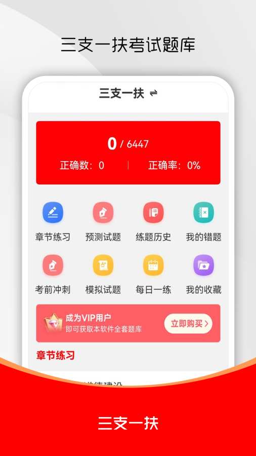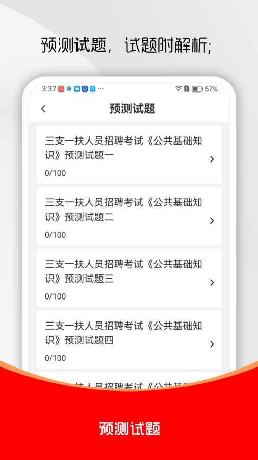 三支一扶考试备考app,大家都在用的三支一扶考试助手!专为备考三支一扶的同学提供题库练习,本软件涵盖了章节练习,历年真题,预测试卷以及题目解析,在复习过程中查漏补缺,提高您的综合分析能力、拓宽知识面。