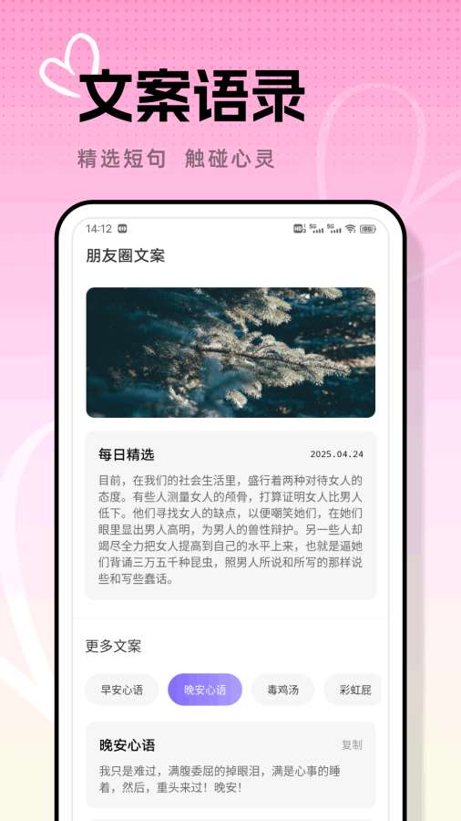 高情商暖心画饼,让异性不开你的恋爱话术!专治嘴硬、情商低,给恋爱菜鸟装上强力 “恋爱助推器” 。我们加入了各种场景恋爱聊天话术,帮你打破尴尬。还有美图工具,使用起来,让你的照片美美哒!更多精彩,下载了解吧! 来自应用汇: 清语