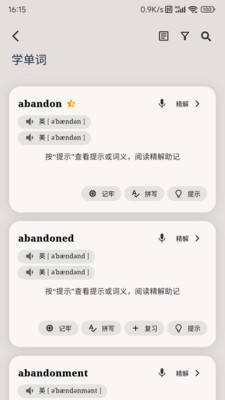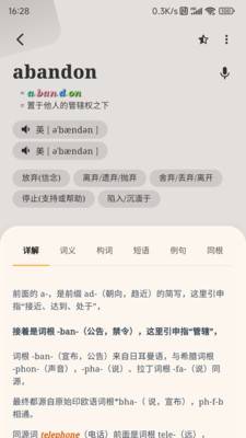 由多位中英文资深语言学专家深入研究、总结、归纳,为英语学习者提供英语单词的“说文解字”。尤其是对英语单词的拼写、读音、词义的演变进行深入解读,帮助用户摆脱死记硬背、深刻理解单词,迅速扩充词汇。不仅易于记忆,而且记得牢,易于培养英语思维。系统集成最新人工智能(AI)技术,为用户提供了词义练习、默写、发音练习、中英互译、听写、猜词等类似游戏的练习复习功能。 来自应用汇: 单词不用背