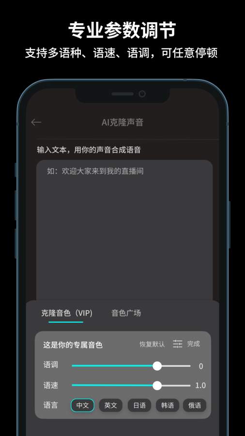 3.专业参数调节:支持语速、语调、停顿等多维度精细调节,更覆盖多语种发音,满足各类场景下的声音定制需求。