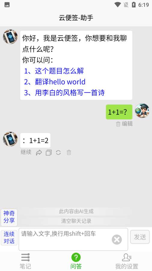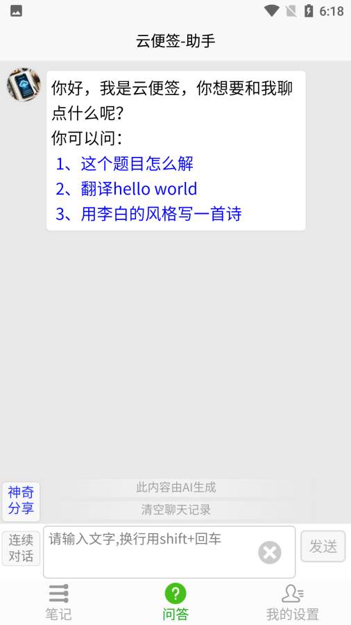 "云便签"是一款集写作、聊天、问答、翻译、笔记、便签功能于一体的AI助手应用。用户可以通过APP记录灵感、制定计划、存储重要信息,同时还能与AI助手进行交流和提问。应用内置翻译功能,支持多国语言互译,方便用户在国际交流中使用。无论是工作学习笔记,还是日常生活琐事,都能在"云便签"中得到便捷的管理和处理,轻松完成各项任务。 来自: 云便签