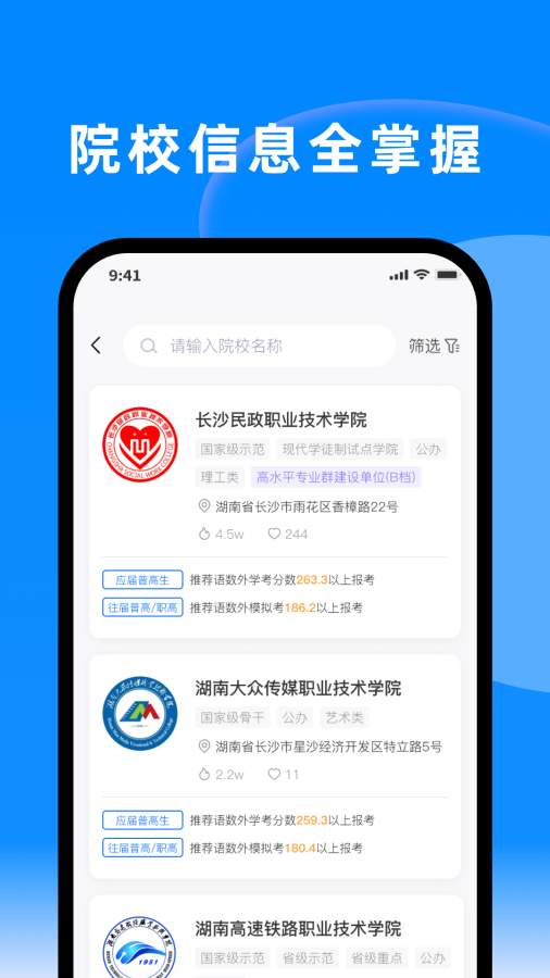 潇湘单招 APP,一款功能超丰富、超全面的专业级手机学习软件,全面覆盖高职院校的各个学科专业。这里面,有着海量针对高职单招考试精心打造的模拟题,搭配上名师授课视频,为你的单招学习之路全方位助力。作为一款综合性学习服务平台,潇湘单招 APP 为你准备了超多实用学习方案。免费的海量题库,让你刷题刷到手软;全程有经验丰富的直播讲解,随时为你答疑解惑;细分模块练习,帮你各个击破知识薄弱点;全真模拟题,还原真实考试场景,提前适应考试节奏;还有贴心的错题收藏纠错功能,让你清晰把握自己的学习问题,针对性提升。不管你身处何地,只要打开 APP,就能随时随地开启学习模式,向着轻松升学的目标大步迈进!