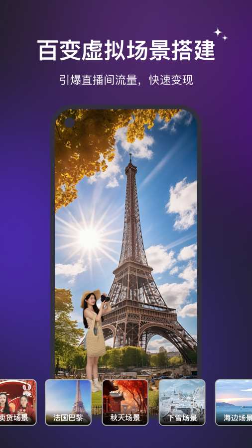 软件内提供了海量素材、直播间模板、多场景切换、多图层搭建、强大美颜、智能遥控、背景音乐音效、多机位投屏、多平台推流直播等功能,让你用一部手机就能轻松搭建明星大牌同款虚拟直播间!