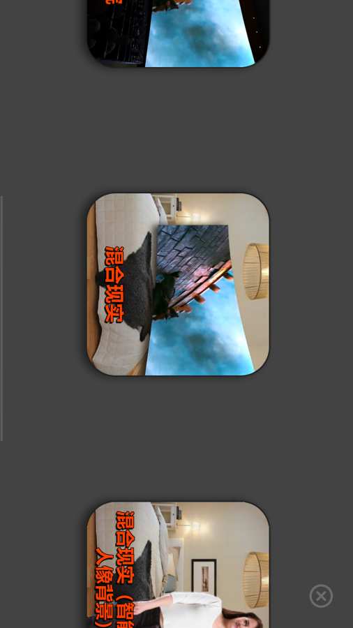 * 混合现实:显示在现实中的一块虚拟巨屏,可任意缩放。将手机后置摄像头的实时画面作为背景,注意不要遮挡后置摄像头。