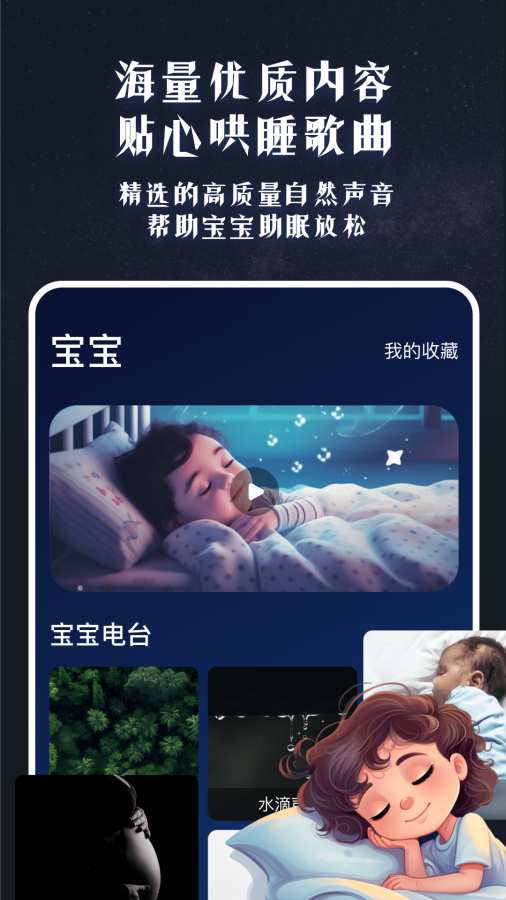 宝宝的歌单:具有丰富多样的宝宝音乐歌单,包括安抚宝宝的轻音乐,哄睡内容,更有宝宝电台可以实时播放适合宝宝的音乐。