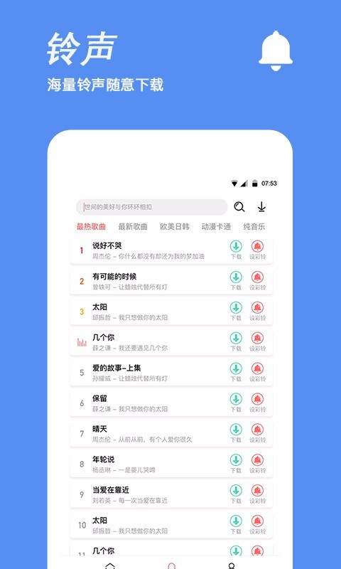 2,种类齐全:海量手机铃声,提供搜索热词榜,最热歌曲、全新歌曲、欧美日韩、影视、动漫卡通、应有尽有。