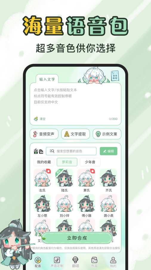 想拥有迷人的音色吗?想让你的美言在朋友圈出声吗?想成为万众瞩目的声优吗?那就快来使用配音神器《芊芊妙音》吧!我们能为大家提供:1.海量音色包,支持多种语言,超简单的使用方法,轻松上手,让您成为专业的配音高手。2.声音定制,制作你喜欢的专属音色,让美妙的声音常伴你左右。3.声音翻唱功能,导入您的歌声,用专属音色唱出来4.魔音工坊,提供各自搞笑有趣的语音,可以在游戏和社交软件变声ps:在使用过程中,有任何问题可在APP里咨询客服,我们期待您的建议和反馈! 来自应用汇: 芊芊妙音