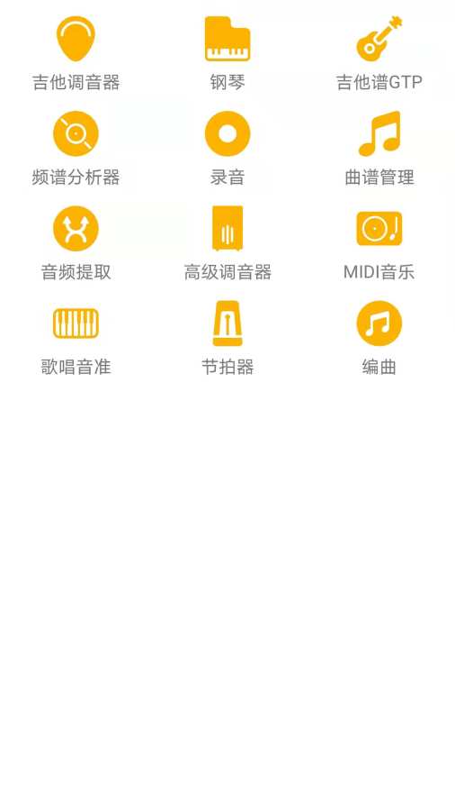 乐器调音包含吉他调音器,可用于吉他调弦;高级调音器,可当做钢琴调音器。采用标准的十二平均律,还可用于多种乐器调音,是很易用的调音器软件。