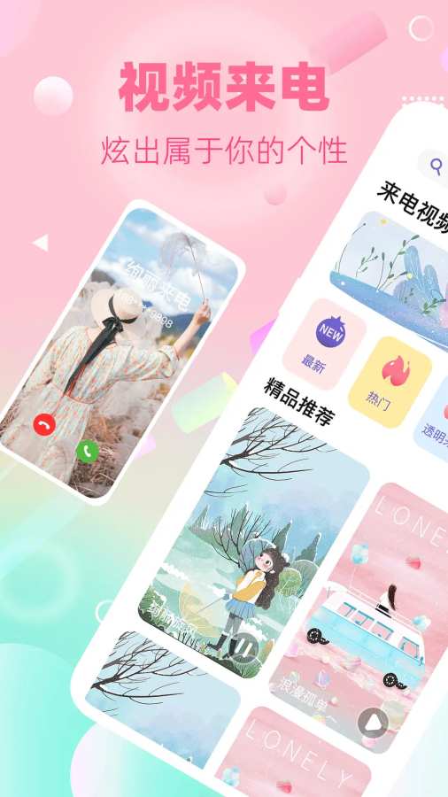 集来电视频、来电铃声、动态壁纸、静态壁纸为一体的来电铃声视频彩铃软件。 【来电视频】 让来电更加炫酷,支持视频的背景声当做来电铃声,很棒的来电秀。 铃声多,火热铃声推荐,应有尽有。 【来电铃声】 个性化定制手机铃声。铃声一键设置剪辑,同时还支持将视频转换成音乐再剪辑 【动态锁屏】 网红壁纸、热门短视频壁纸,热门动画,美女视频应有尽有,一键轻松设为桌面锁屏。 【静态壁纸】 美女,卡通,风景,动漫,搞笑各种壁纸种类多多让您告别沉闷,紧跟潮流的步伐,赶快下载吧。透明屏幕动态壁纸使用您的设备相机显示图像并将启动器转换为透明。透明屏幕应用程序您可以照常操作手机,有多重色系选择,还有屏幕形状区分等,多式多样!极具创意的视频桌面玩法,手机桌面就此与众不同。