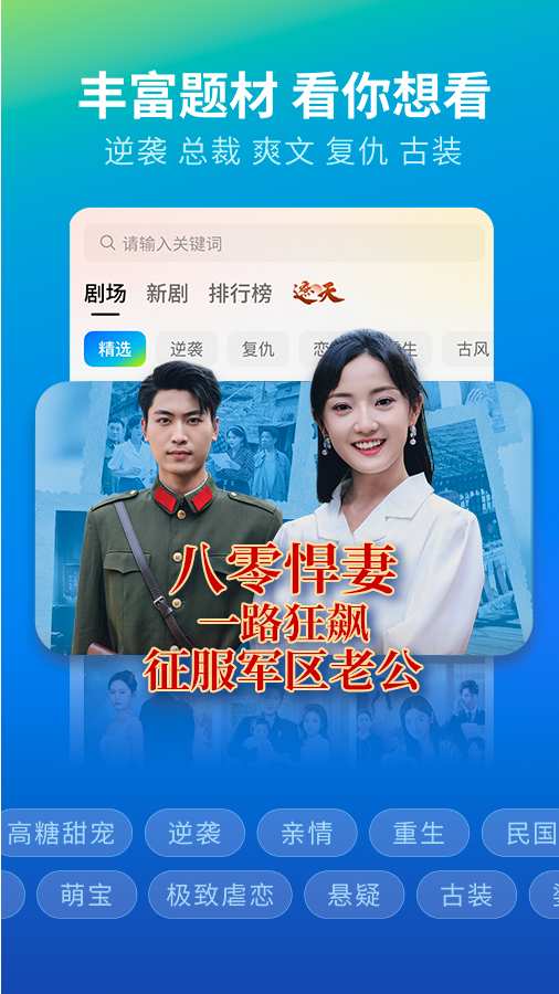核心短剧资源:主打免费短剧,覆盖轻松甜宠、逆袭爽文、虐文复仇、智斗谋略、奇幻快穿、亲人温情、战神流等热门题材,无论你偏爱哪种风格,都能在这里找到心头好。
