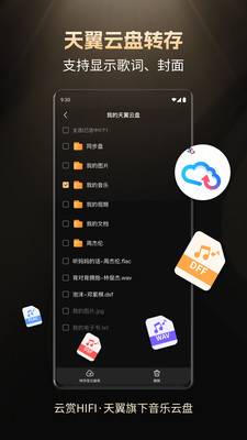 下载的歌曲总要来回迁移?私人云曲库解决你的烦恼!你可上传歌曲文件到云赏HIFI,实现云端储存歌曲不丢失,多平台播放音乐;支持从天翼云盘一键转存。