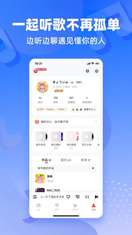 8、想自嗨原创音乐被广大网友所认同吗?那赶紧来快音悦吧!录制您的美妙歌声,一键上传平台,永久保存您的美妙嗓音,还有机会上推荐哟!万人迷说的就是你!!!