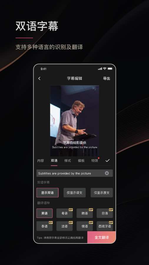 支持英文、日语、韩语等多种语言,自动翻译,双语字幕一步完成。