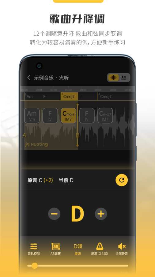 火听云共创提供12个调性的自由升降功能。只需一键操作,即可将歌曲及和弦同步变调至更易演奏的调性,特别适合新手练习使用,让音乐学习之路更加顺畅无阻。