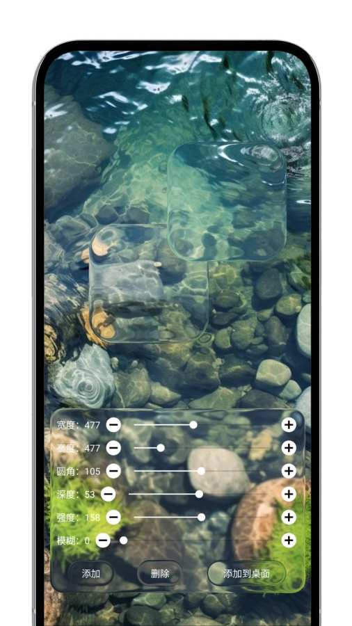 小组件背景:为每个小组件或文件夹添加液态磨砂玻璃背景,信息显示清晰又优雅,各项玻璃参数个性化定义,赋予桌面前所未有的高感。