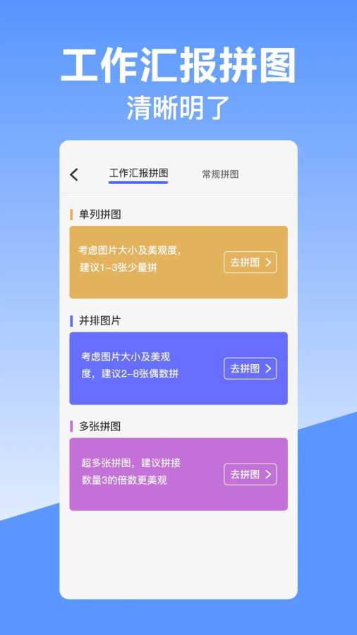 支持多张照片拼图模式,形成今日汇报,一键分享即可完成今日的工作汇报,汇报工作更架高效。同时支持常规拼图等日常拼图所需。