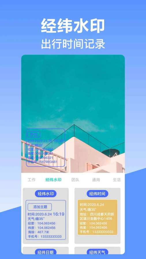 模板丰富,包含工作水印、经纬水印、生活旅游水印、日常通用水印,提供考勤打卡、工程打卡、执勤打卡、学习打卡、经纬水印打卡、经纬时间打卡、经纬日期打卡、经纬天气打卡、提供日期、日历、农历、旅游定位等水印。