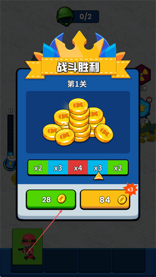 4、战斗胜利后,领取金币奖励如28枚,用于提升小兵战力,继续挑战后续关卡。