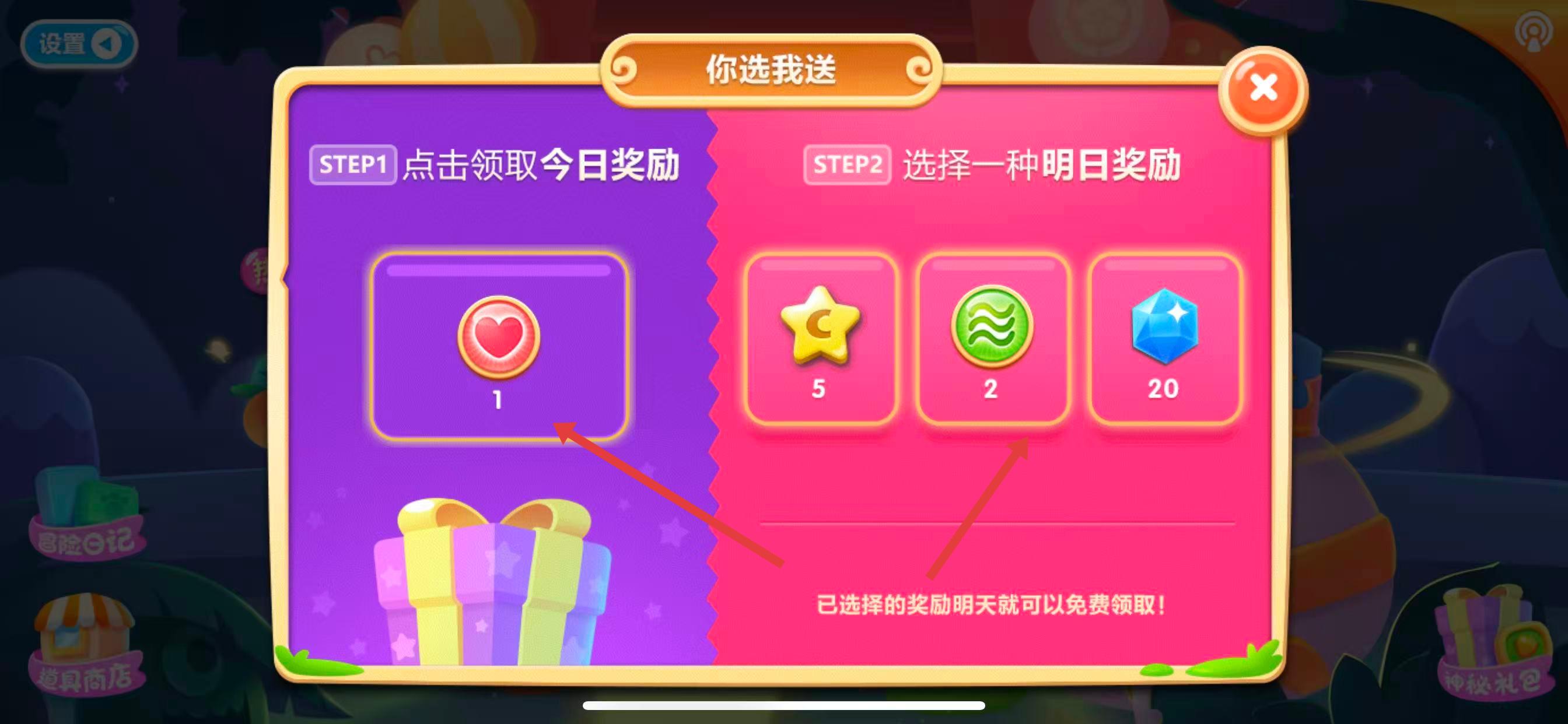 3、进入具体活动页面后,点击领取今日奖励,或者选择明日奖励,获得游戏道具。