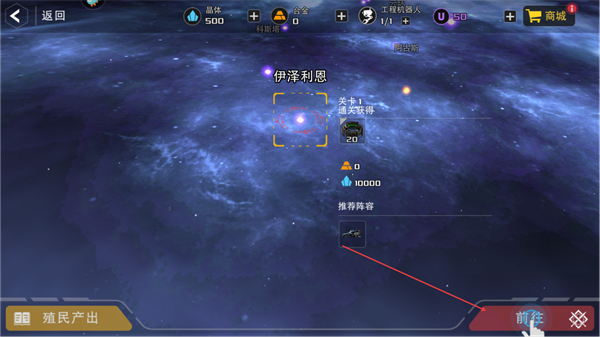 1、选择伊泽利恩关卡,点击前往进入战场,准备太空战斗。