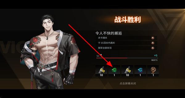 4、战斗胜利后获取对应的奖励道具,点击屏幕关闭结算界面,继续推进游戏的后续内容。