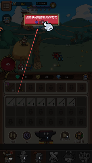 1、按提示点击铁锭制作箭矢,积累箭矢数量,为战斗做准备。
