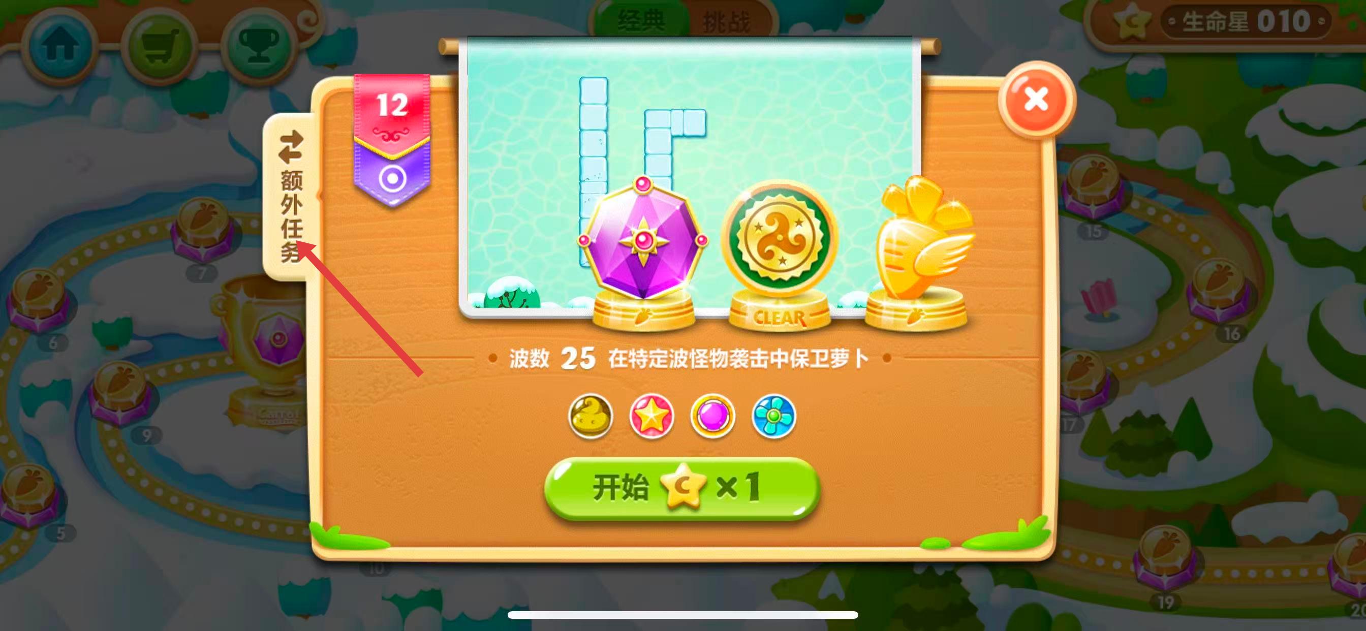 4、在弹出的额外任务界面中,即可查看该关卡的额外任务要求,如建造指定数量的特定炮塔、限时清除道具等内容。