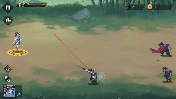1、进入战斗场景,操控白衣角色攻击敌方小怪,积累击杀数7与金币0,推进战斗。