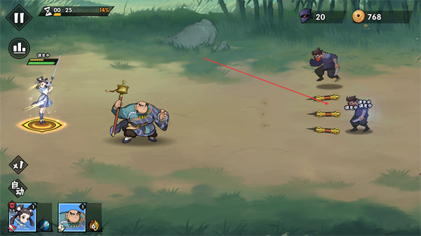 3、使用角色技能攻击敌方集群,清理小怪,积累击杀数20与金币768,强化队伍。