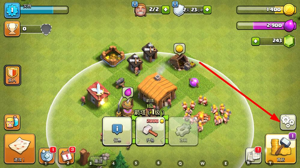 1、打开部落冲突游戏,进入游戏主界面后点击右下角齿轮状设置按钮。