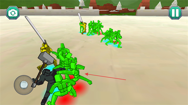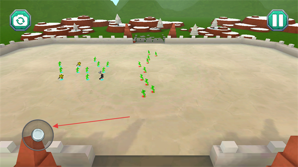 2、进入战场,通过左下角按钮调整视角,观察木偶人队伍战斗。