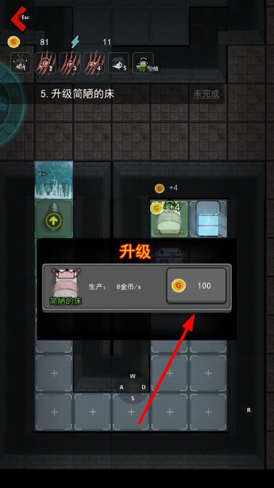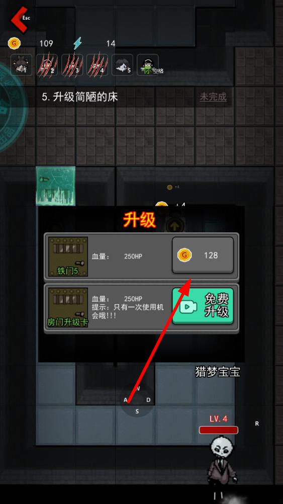 2、当金币足够时,升级床铺获得更多金币,升级房门来增强防御能力,抵御猛鬼的攻击,合理规划建造炮台等防御设施攻击前来的猛鬼消耗其血量。