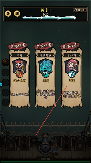 1、在关卡1界面选择出战角色如杰克、元素阿水、卡拉玛,配置上阵阵容。