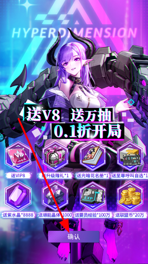 2、会有开局福利领取,像送VIP8、万抽等,点击确认,即可获得这些福利,这些福利能为前期冒险提供助力,让角色更快成长。