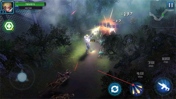 2、操控角色移动,用武器攻击僵尸,击败后获取+82经验值,积累经验提升等级。