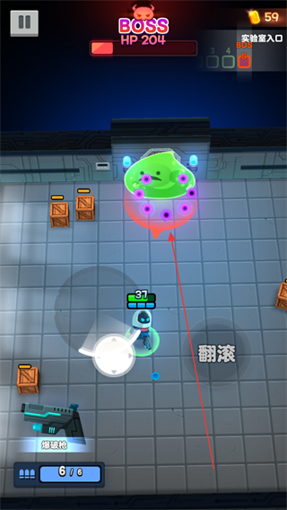1、面对BOSS时,利用翻滚技能躲避攻击,同时用爆裂枪持续输出,削减其HP。