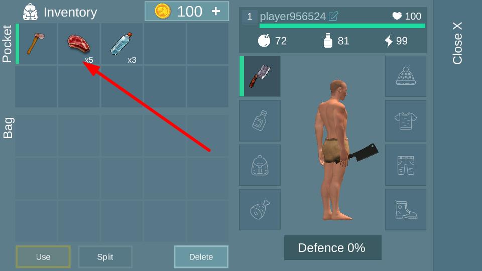 3、在inventory界面中,点击箭头指向的生肉,可查看或使用该资源,生肉可用于补充饥饿值。