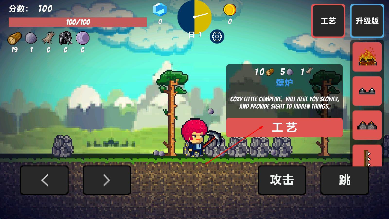 1、进入游戏后,先熟悉左下角移动按键与右侧攻击、跳跃按键的操作,通过劈柴获取木材、挖掘地面寻找基础矿石,完成首次资源收集。