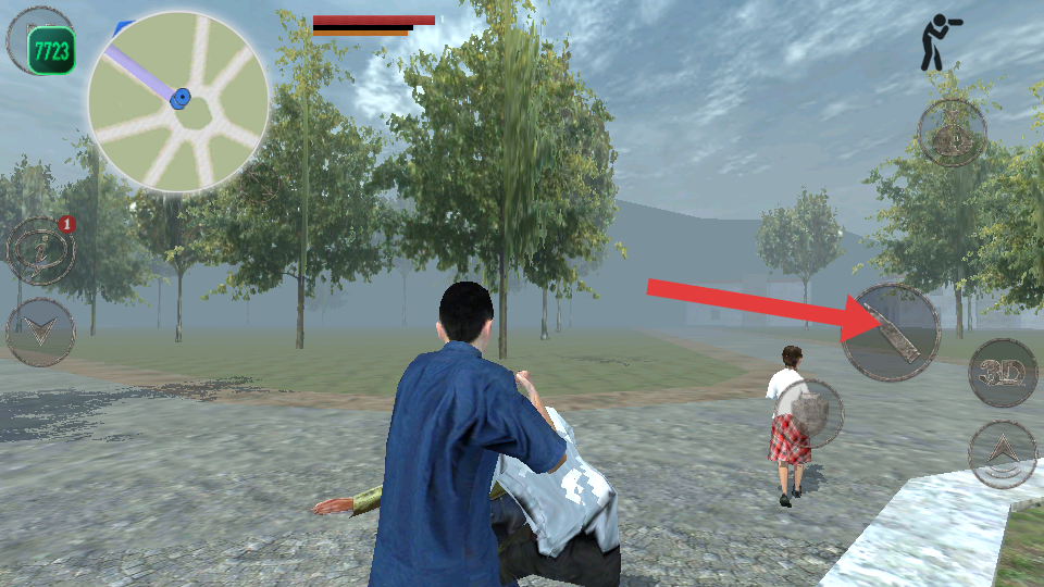 1、在动作冒险游戏中,角色可使用武器按钮发起攻击,在公园场景中与敌人战斗,这是提升战斗能力。