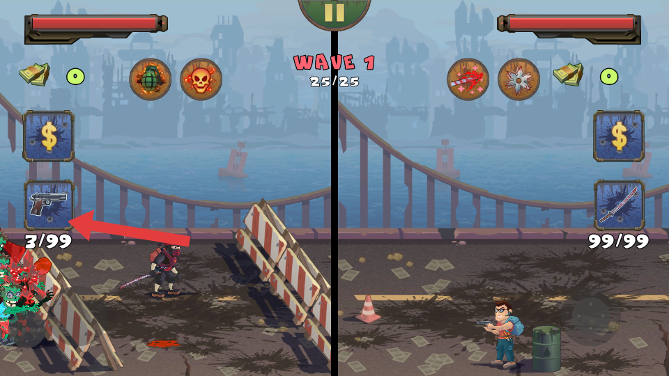 2、核心攻防操作:操控双英雄在场景中移动,利用武器瞄准僵尸攻击,同时搭建防御设施阻挡敌人推进,遭遇分散僵尸时合理分配两名英雄的防守与攻击范围。