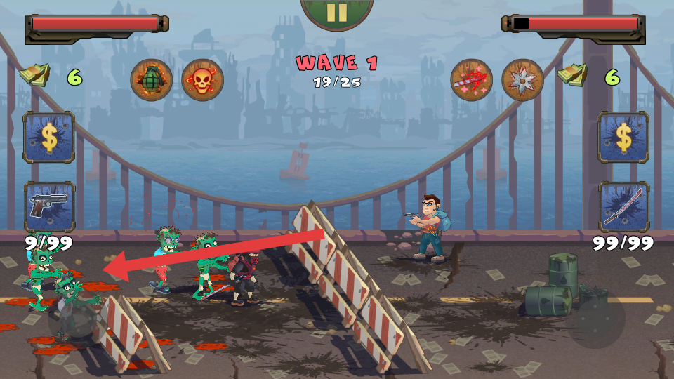 2、当僵尸靠近时,注意箭头指向的僵尸移动方向,操控角色移动,躲避僵尸的攻击,同时寻找合适的射击角度,僵尸输出伤害。