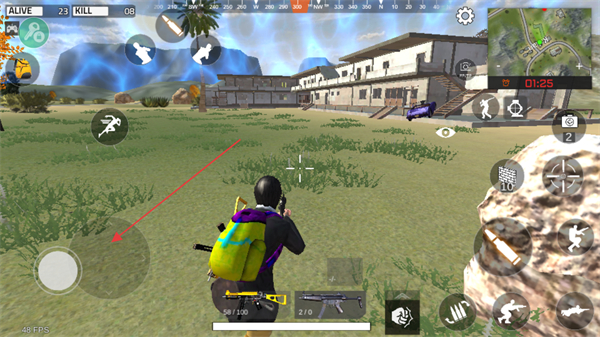 1、操控左侧移动键调整位置,瞄准目标区域,准备向建筑方向移动。