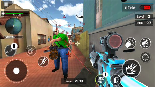 1、战斗时,利用左侧虚拟摇杆移动,右侧瞄准射击,针对不同敌人如持重武器的胖子敌人,精准射击其要害,快速消灭。
