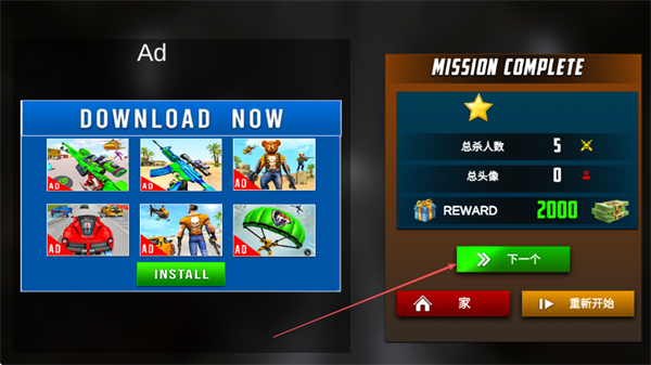 4、每关消灭指定数量的敌人如总杀人数5后,即可达成MISSIONCOMPLETE,获取奖励,点击下一个进入下一关继续挑战。